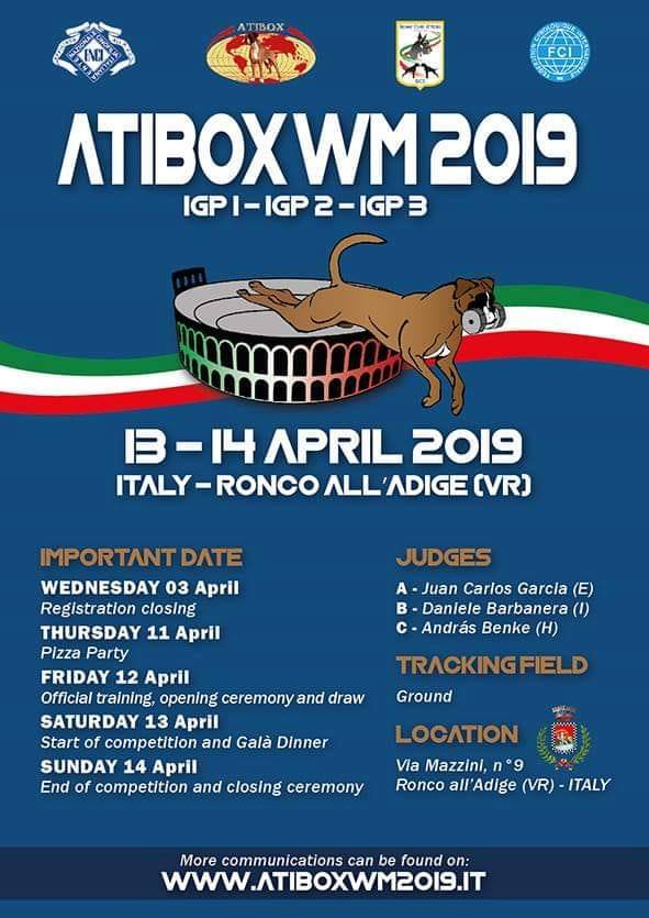 > No passado dia 25 e 26 de maio, decorreu em Oradea, Roménia, o Campeonato do Mundo Boxer, Atibox. Contou com a presença de 6 exemplares de expositores Portugueses, ou criados em Portugal. Uma representação digna de registo, dignificando o Boxerismo Português. A direção do Boxer Clube felicita todos os intervenientes que honraram o boxerismo Nacional com a sua presença apesar dos tempos dificeis que vivemos. Uma palavra especial de agradeciemnto ao nosso associado Paulo Fernandes, que na cerimónia de abertura do evento, fez a representação de Portugal. Parabéns a todos... Carlos Filipe Cruz .: Consulte os resultados :. 31 de Maio